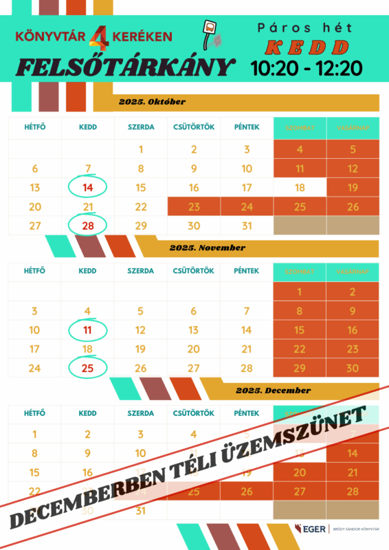 A felsőtárkányi Általános Iskola felújítása miatt a Bródy Sándor Könyvtár ideiglenesen Könyvtárbuszos szolgáltatást biztosít a település számára 2022. július 12-től az alábbi menetrend szerint: